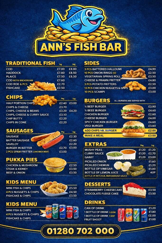Ann’s Fish Bar focuses on quality ingredients, consistent flavour, and friendly service. Whether you’re looking for a classic takeaway, a quick lunch, or a comforting evening meal, this Brackley fish and chip shop delivers reliable taste, great value, and the kind of food that keeps customers coming back again and again.